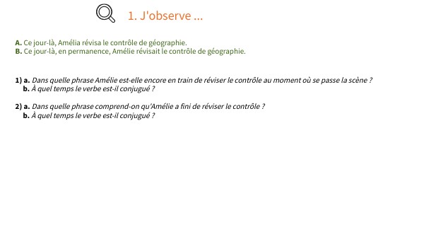 1) a. Dans quelle phrase Amélie est-elle encore en train de réviser le contrôle au moment où se passe la scène ? b. À quel temps le verbe est-il conjugué ? 2) a. Dans quelle phrase comprend-on qu'Amélie a fini de réviser le contrôle ? b. À quel temps le verbe est-il conjugué ?