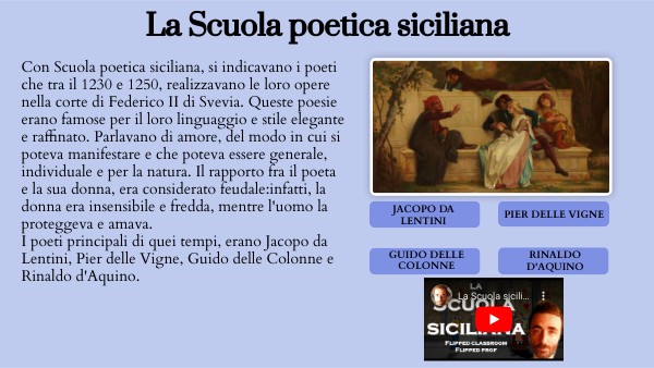 Con Scuola poetica siciliana, si indicavano i poeti che tra il 1230 e 1250, realizzavano le loro opere nella corte di Federico II di Svevia. Queste poesie erano famose per il loro linguaggio e stile elegante e raffinato. Parlavano di amore, del modo in cui si poteva manifestare e che poteva essere generale, individuale e per la natura. Il rapporto fra il poeta e la sua donna, era considerato feudale:infatti, la donna era insensibile e fredda, mentre l'uomo la proteggeva e amava. I poeti principali di quei tempi, erano Jacopo da Lentini, Pier delle Vigne, Guido delle Colonne e Rinaldo d'Aquino.