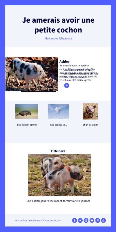 Je amerais avoir une petite cochon.Elle s'appelle Ashley.Elle est a cochon de 2 ans. Elle avoir un poil ras, blanc et noir. Elle avoir les yeux bleu et les oreilles petite.