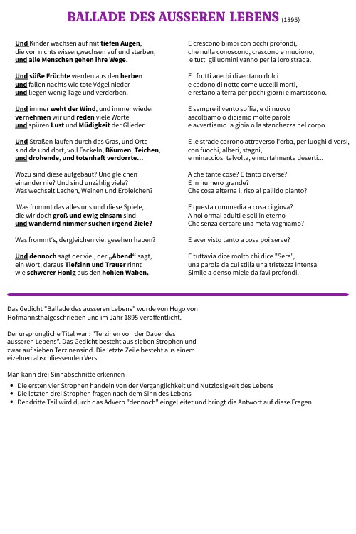 Das Gedicht "Ballade des ausseren Lebens" wurde von Hugo von Hofmannsthal geschrieben und im Jahr 1895 veroffentlicht. Der ursprungliche Titel war : "Terzinen von der Dauer des ausseren Lebens". Das Gedicht besteht aus sieben Strophen und zwar auf sieben Terzinen sind. Die letzte Zeile besteht aus einem eizelnen abschliessenden Vers. Man kann drei Sinnabschnitte erkennen :