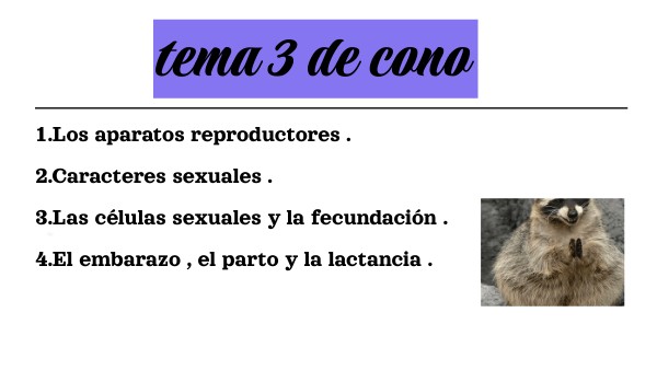 1.Los aparatos reproductores . 2.Caracteres sexuales . 3.Las células sexuales y la fecundación . 4.El embarazo , el parto y la lactancia .