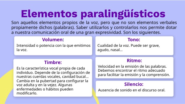 Son aquellos elementos propios de la voz, pero que no son elementos verbales propiamente dichos (palabras). Saber utilizarlos y controlarlos nos permite dotar a nuestra comunicación oral de una gran expresividad. Son los siguientes.