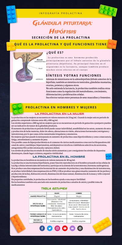 Además de sintetizarse en la adenohipófisis (lóbulo anterior de la hipófisis, también se sintetiza en testículos, glándulas mamarias, ovarios, próstata y algunos otros.No solo estimula la lactancia, la prolactina también realiza otras funciones como la regulación del metabolismo, crecimiento, diferenciación y proliferación celular. Sus efectos varían entre personas de sexo masculino y femenino.