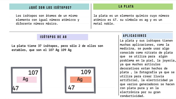 La plata tiene 37 isótopos, pero sólo 2 de ellos son estables, que son el 107 Ag 109 Ag