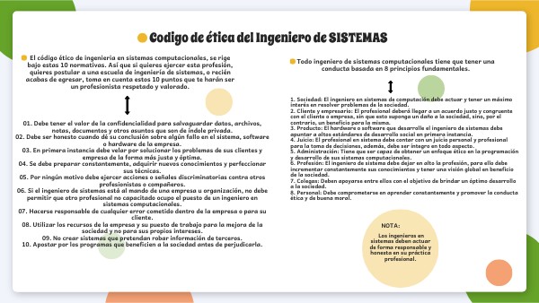 01. Debe tener el valor de la confidencialidad para salvaguardar datos, archivos, notas, documentos y otros asuntos que son de índole privada. 02. Debe ser honesto cuando dé su conclusión sobre algún fallo en el sistema, software o hardware de la empresa. 03. En primera instancia debe velar por solucionar los problemas de sus clientes y empresa de la forma más justa y óptima. 04. Se debe preparar constantemente, adquirir nuevos conocimientos y perfeccionar sus técnicas. 05. Por ningún motivo debe ejercer acciones o señales discriminatorias contra otros profesionistas o compañeros. 06. Si el ingeniero de sistemas está al mando de una empresa u organización, no debe permitir que otro profesional no capacitado ocupo el puesto de un ingeniero en sistemas computacionales. 07. Hacerse responsable de cualquier error cometido dentro de la empresa o para su cliente. 08. Utilizar los recursos de la empresa y su puesto de trabajo para la mejora de la sociedad y no para sus propios intereses. 09. No crear sistemas que pretendan robar información de terceros. 10. Apostar por los programas que beneficien a la sociedad antes de perjudicarla.
