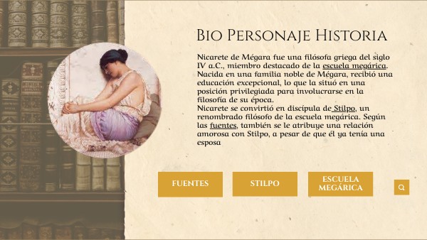 Nicarete de Mégara fue una filósofa griega del siglo IV a.C., miembro destacado de la escuela megárica. Nacida en una familia noble de Mégara, recibió una educación excepcional, lo que la situó en una posición privilegiada para involucrarse en la filosofía de su época. Nicarete se convirtió en discípula de Stilpo, un renombrado filósofo de la escuela megárica. Según las fuentes, también se le atribuye una relación amorosa con Stilpo, a pesar de que él ya tenía una esposa