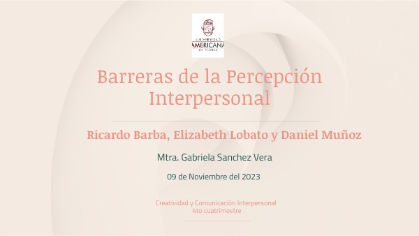 Las Barreras de la percepción interpersonal son una limitación de la comunicación por factores mas alla de los que se dan en una conerversacion habitual, es decir, por ideas, pensamientos, sentimientos, emociones, etc, por lo que sera importante reconocer estos detalles para asi mostrar mas empatia con el otro a la hora de establecer la comunicacion.