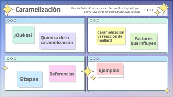 - Quimica de la caramelizacion. (n.d.). http://cienciaconbuengusto.es/Teoria/CARAMELO/CARAMELIZACI%C3%93N.htm