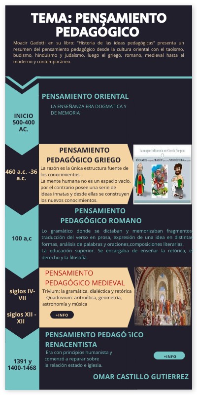 Moacir Gadotti en su libro: “Historia de las ideas pedagógicas” presenta un resumen del pensamiento pedagógico desde la cultura oriental con el taoísmo, budismo, hinduismo y judaísmo, luego el griego, romano, medieval hasta el moderno y contemporáneo.