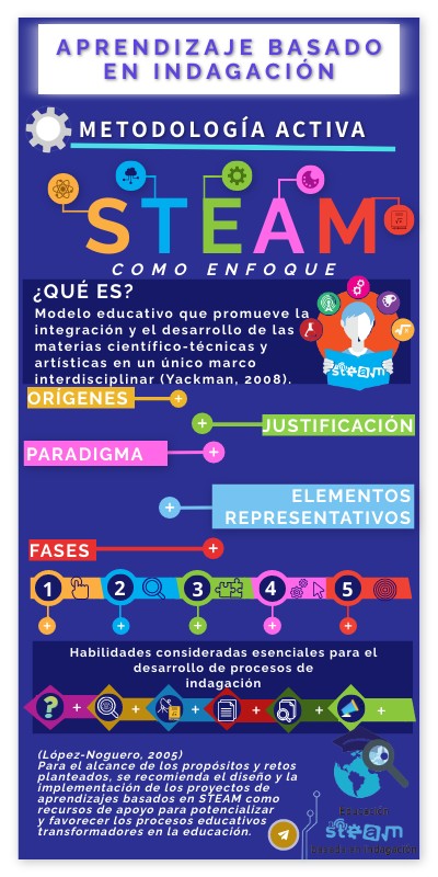 - Aprendizaje: la educación STEAM puede ser Confirmatoria (verificación de leyes y teorías) Estructurada (articulación preliminar determinada) Guiada (orientación del facilitador) Abierta (articulación preliminar indeterminada).