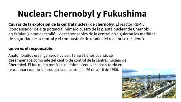 Causas de la explosion de la central nuclear de chernobyl:El reactor RBMK (condensador de alta potencia) número cuatro de la planta nuclear de Chernóbil, en Prípiat (Ucrania) estalló. Los responsables de la central no siguieron las medidas de seguridad de la central y el combustible de uranio del reactor se recalentó. quien es el responsable: