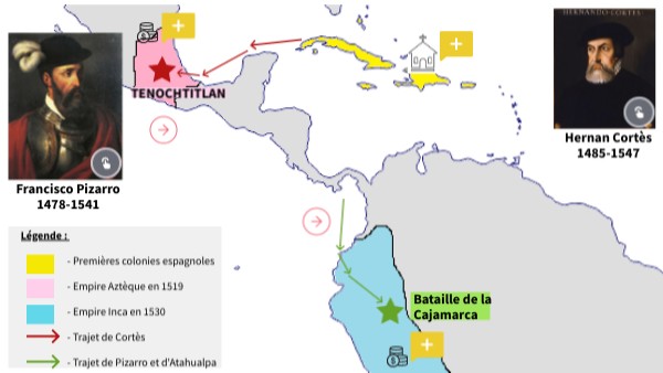Légende : - Premières colonies espagnoles - Empire Aztèque en 1519 - Empire Inca en 1530 - Trajet de Cortès - Trajet de Pizarro et d'Atahualpa