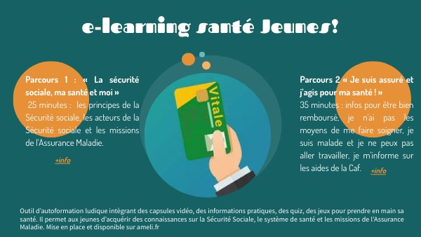 Outil d’autoformation ludique intègrant des capsules vidéo, des informations pratiques, des quiz, des jeux pour prendre en main sa santé. Il permet aux jeunes d’acquérir des connaissances sur la Sécurité Sociale, le système de santé et les missions de l’Assurance Maladie. Mise en place et disponible sur ameli.fr