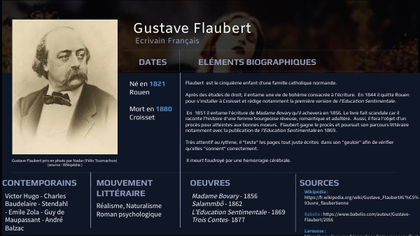 Wikipédia : https://fr.wikipedia.org/wiki/Gustave_Flaubert#L'%C5%93uvre_flaubertienne Babelio : https://www.babelio.com/auteur/Gustave-Flaubert/2056 Larousse : https://www.larousse.fr/encyclopedie/personnage/Gustave_Flaubert/119630