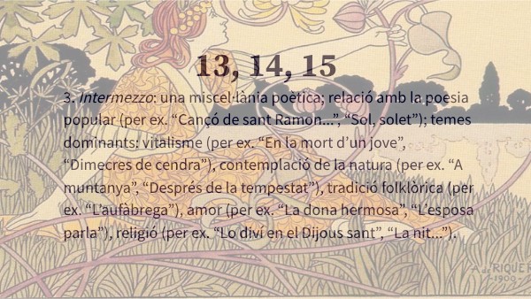 3. Intermezzo: una miscel·lània poètica; relació amb la poesia popular (per ex. “Cançó de sant Ramon...”, “Sol, solet”); temes dominants: vitalisme (per ex. “En la mort d’un jove”, “Dimecres de cendra”), contemplació de la natura (per ex. “A muntanya”, “Després de la tempestat”), tradició folklòrica (per ex. “L’aufàbrega”), amor (per ex. “La dona hermosa”, “L’esposa parla”), religió (per ex. “Lo diví en el Dijous sant”, “La nit...”).