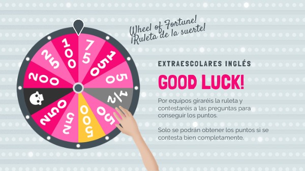 Por equipos giraréis la ruleta y contestaréis a las preguntas para conseguir los puntos. Solo se podrán obtener los puntos si se contesta bien completamente.