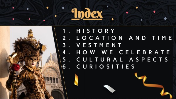 1. HISTORY2. LOCATION AND TIME 3. vestment 4. HOW WE CELEBRATE 5. CULTURAL ASPECTS 6. CURIOSITIES 7. bibliography