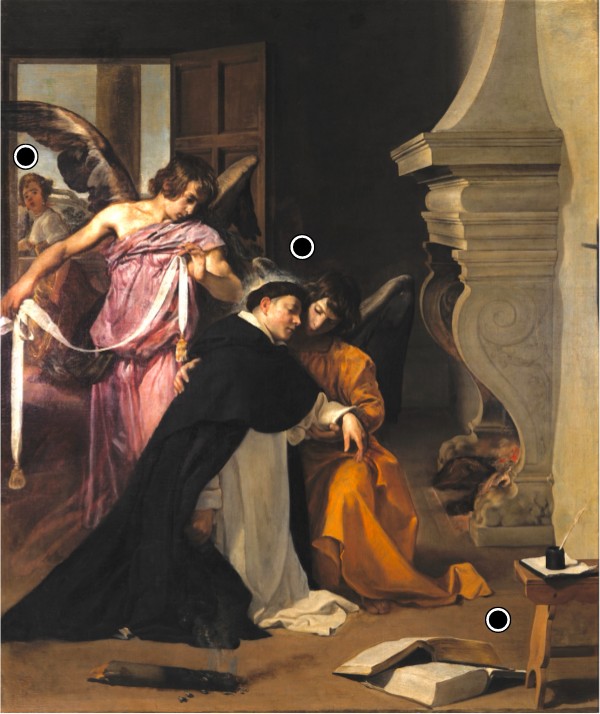 Desde muy temprana edad, Santo Tomás experimentó una gran vocación hacia la vida apostólica, lo que lo lleva a ingresar en la orden de los dominicos con diecinueve años. Sin embargo, su familia no estaba conforme con su decisión, por lo que emplearon todos los medios posibles para que cambiase de opinión. Cuando Tomás se preparaba para viajar a Roma y seguir sus estudios, sus hermanos lo secuestraron y lo encerraron en el castillo familiar. A pesar de su encierro, el continuó con sus estudios. En un intento desesperado, los hermanos consideraron en enviar a una mujer para tentarlo. la mujer accedió al interior de la habitación, pero cuando la vio, tomó un tizón de la chimenea y trazó una cruz en la pared para arrodillarse y rezar a Dios. En ese mismo instante aparecieron dos ángeles para sostener al santo, quién desfalleció por la lucha contra la tentación. Mientras tanto, el otro ángel porta el cíngulo de la castidad para imponérselo al santo.
