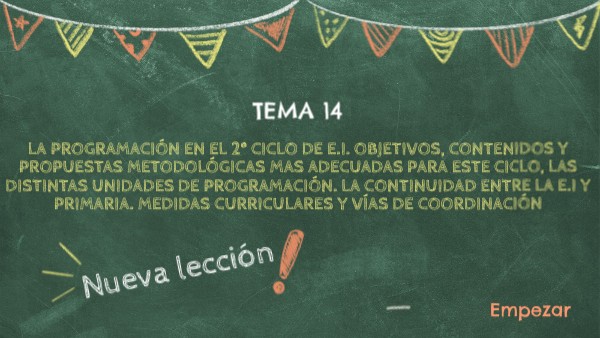 En este tema hablaremos del 2º ciclo de la EI (de 3 a 6 años) que así se ordena y se establece en la LOMLOE, que es el marco legal sobre educación, RD 95/2022 y la normativa autonómica de CyL Decreto 37/2022. Hablaremos del currículo y sus elementos en el 2º ciclo para poder contextualizarlos al centro educativo, y en concreto, al grupo-aula, y a cada niño de forma individual con la programación didáctica o de aula, función ésta del maestro, en colaboración con la familia y con el equipo docente de centro y resto de profesionales. Finalizaremos el tema hablando de la coordinación con la etapa siguiente: la educación primaria.