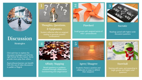 Click each box to explore the discussion strategies and find the right format for your lesson. Some provide more prep than others. Asyncrohouse learners can benefit from the use of video discussions in padlet or flipgrid.