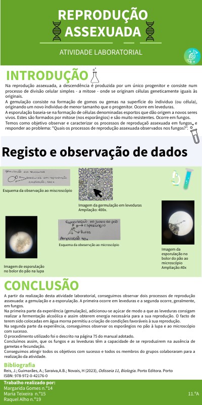 A partir da realização desta atividade laboratorial, conseguimos observar dois processos de reprodução assexuada: a gemulação e a esporulação. A primeira ocorre em leveduras e a segunda ocorre, geralmente, em fungos. Na primeira parte da experiência (gemulação), adicionou-se açúcar de modo a que as leveduras consigam realizar a fermentação alcoólica e assim obterem energia necessária para a sua reprodução. O facto de terem sido colocadas em água morna permitiu a criação de condições favoráveis à sua reprodução. Na segunda parte da experiência, conseguimos observar os esporângios no pão à lupa e ao microscópio com sucesso. O procedimento utilizado foi o descrito na página 75 do manual adotado. Concluímos assim, que os fungos e as leveduras têm a capacidade de se reproduzirem na ausência de gametas e fecundação. Conseguimos atingir todos os objetivos com sucesso e todos os membros do grupos colaboraram para a realização da atividade.