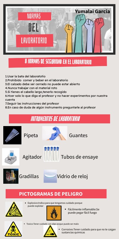 1.Usar la bata del laboratotio 2.Prohibido comer y beber en el laboratorio 3.El calzado debe ser cerrado no puede estar abierto 4.Nunca trabajar con el material roto 5.Si tienes el cabello largo,tenerlo recogido 6.Hcer solo lo que diga el profesor y no hacer experimentos por nuestra cuenta 7.Seguir las instrucciones del profesor 8.En caso de duda de algún instrumento preguntarle al profesor