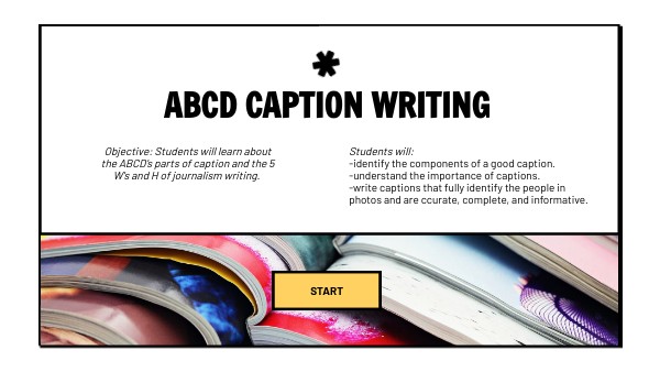 Objective: Students will learn about the ABCD’s parts of caption and the 5 W's and H of journalism writing.