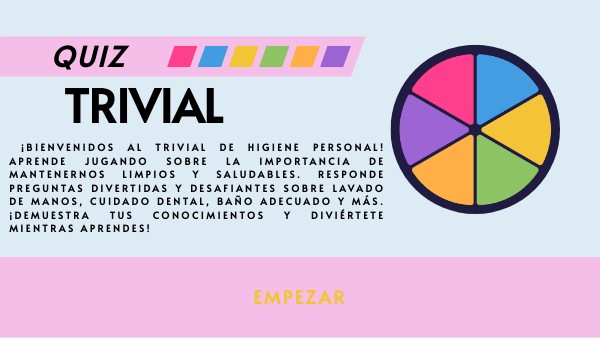 ¡Bienvenidos al Trivial de Higiene Personal! Aprende jugando sobre la importancia de mantenernos limpios y saludables. Responde preguntas divertidas y desafiantes sobre lavado de manos, cuidado dental, baño adecuado y más. ¡Demuestra tus conocimientos y diviértete mientras aprendes!