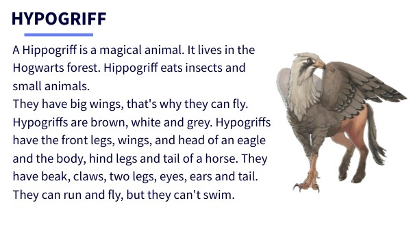 A Hippogriff is a magical animal. It lives in the Hogwarts forest. Hippogriff eats insects and small animals. They have big wings, that's why they can fly. Hypogriffs are brown, white and grey. Hypogriffs have the front legs, wings, and head of an eagle and the body, hind legs and tail of a horse. They have beak, claws, two legs, eyes, ears and tail. They can run and fly, but they can't swim.