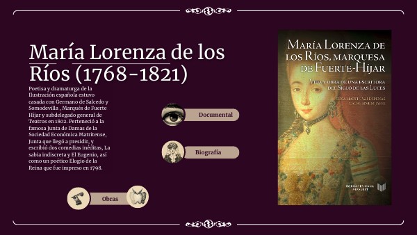 María Lorenza de los Ríos y Lorza nació en Cádiz, el 10 de agosto de 1771. Fue una poetisa, dramaturga y salonnière en España. Perteneció a la Junta de Damas de Honor y Mérito de la Real Sociedad Económica Matritense de Amigos del País, ocupando diferentes puestos directivos. Accedió a la presidencia de la citada junta en 1811 estando en ella hasta 1814, y durante ese tiempo elaboró un informe sobre La educación moral de la mujer que trataba de reformular el modelo tradicional. La anfitriona, conocida por su afición a las letras, organizaba reuniones literarias a la francesa como salonnière y representaciones teatrales en su casa. Ella era una mujer culta perteneciente a la élite social y cultural de la España de la época, siendo prototipo de mujer ilustrada, amante del teatro y de la poesía.