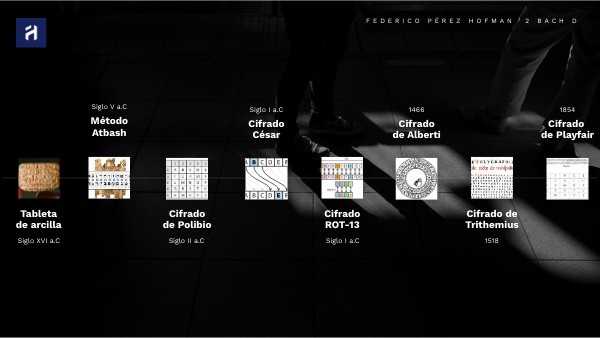 Este trabajo consiste en una linea del tiempo en la que se muestra 8 métodos de encriptación con un tiempo lineal, es decir, de más antiguo a más nuevo.