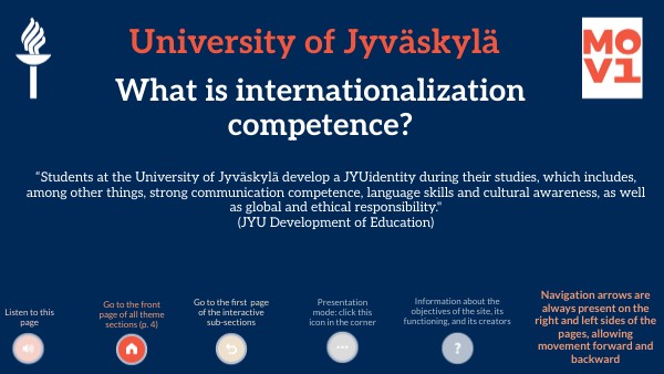 Special thanks: Hanna Brauer, Akiko Ichinose, Yara Jueru, Eleni Moens, Fanny Natri, Onni Natri, Christian Ollivier, Margareta Pietarinen, Dominik Reinert More information: teija.natri@jyu.fi Images: unDraw, JYU, T. Natri1. The website presents attitudes, knowledge, and skills related to multilingual and intercultural communication competence from the perspective of languages and communication. 2. It is intended to help articulate internationalisation competence. 3. The target group is JYU students and study counselors. 4. The site covers six different themes.