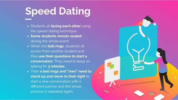 - Then a bell rings and “men” need to stand up and move to their right to start a new conversation with a different partner and the whole process is repeated again.