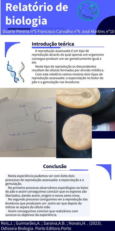Nesta experiência pudemos ver com êxito dois processos de reprodução assexuada: a esporulação e a gemulação. No primeiro processo observámos esporângios no bolor do pão e assim conseguimos concluir que os esporos são libertados, dando assim, origem a novos seres vivos. No segundo processo consguimos ver a reprodução das leveduras que produzem um outro ser que depois da mitose se separa da célula mãe. Assim conseguimos concluir que realizámos com sucesso os objetivos da experiência.