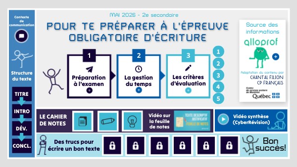 Les éléments susceptibles d'être utiles pour vérifier et améliorer la qualité de ton texte, comme des notions grammaticales Une liste de mots appropriés pour ne pas répéter le sujet de ton texte (reprise de l'information). Une liste de marqueurs de relations et d'organisateurs textuels. Différentes façons pour susciter l'intérêt du destinataire (le nommer, le questionner, l'amener à réfléchir, etc.). La structure du texte à rédiger, mais il y a plusieurs façons de faire puisqu'il n'y a pas qu'une seule structure exigée lors de cette épreuve.