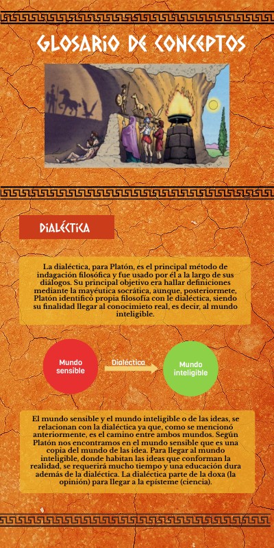 La dialéctica, para Platón, es el principal método de indagación filosófica y fue usado por él a la largo de sus diálogos. Su principal objetivo era hallar definiciones mediante la mayéutica socrática, aunque, posteriormete, Platón identificó propia filosofía con le dialéctica, siendo su finalidad llegar al conocimieto real, es decir, al mundo inteligible.