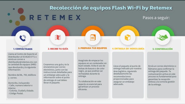 Llama al Centro de Soporte al Distribuidor al 55 8526 5771 o envía un correo a distribuidor@retemex.mx con la cantidad de equipos (IMEI) que devolverás y la siguiente información: Nombre del BL, TID, teléfono y correo. Domicilio, incluyendo: - Calle, numero exterior e interior. - Colonia, Ciudad y Estado. - Código Postal.