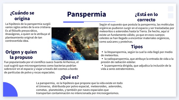 ▪ la litopanspermia, según la cual la vida llegó por medio de meteoritos. ▪ la radiopanspermia, que atribuye la entrada de vida a la presión de radiación estelar. ▪ la panspermia dirigida, que adjudica la inclusión de la vida a seres extraterrestres.