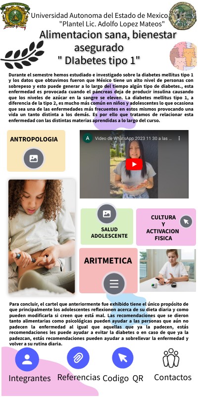 Durante el semestre hemos estudiado e investigado sobre la diabetes mellitus tipo 1 y los datos que obtuvimos fueron que México tiene un alto nivel de personas con sobrepeso y esto puede generar a lo largo del tiempo algún tipo de diabetes., esta enfermedad es provocada cuando el páncreas deja de producir insulina causando que los niveles de azúcar en la sangre se eleven. La diabetes mellitus tipo 1, a diferencia de la tipo 2, es mucho más común en niños y adolescentes lo que ocasiona que sea una de las enfermedades más frecuentes en estos mismos provocando una vida un tanto distinta a los demás. Es por ello que tratamos de relacionar esta enfermedad con las distintas materias aprendidas a lo largo del curso.