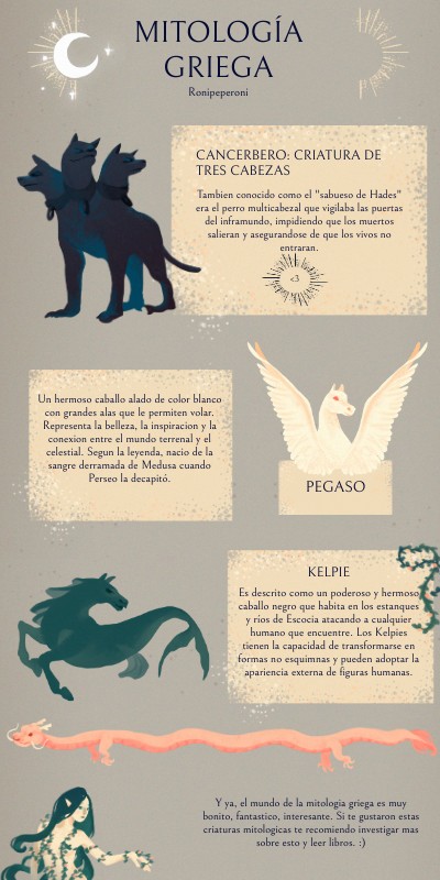 Y ya, el mundo de la mitologia griega es muy bonito, fantastico, interesante. Si te gustaron estas criaturas mitologicas te recomiendo investigar mas sobre esto y leer libros. :)