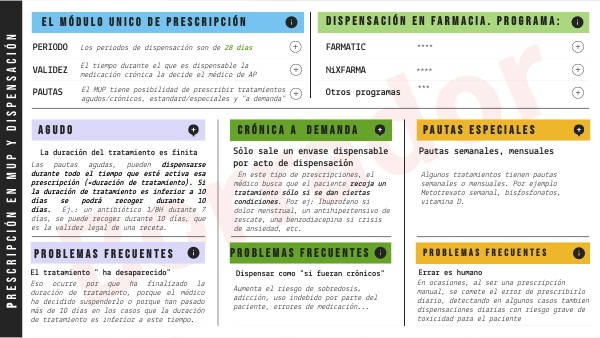 - Pautas para dispensación programada vs a demanda: El médico puede decidir que las prescripciones se dispensen únicamente si se cumplen ciertas condiciones que ha explicado previamente al paciente (pautas a demanda). En ocasiones puede estar explicado previamente en la parte de "información a paciente" o "información al farmacéutico". Un ejemplo es la prescripción de analgesia si dolor menstrual o un tratamiento prescrito para crisis hipertensivas. Son tratamientos que están pensados de manera puntual, y no debemos confundirlos con los tratamientos crónicos. Una paciente puede tener dolor menstrual durante varios años, pero no quiere decir que deba recoger a diario todos los analgésicos pautados.