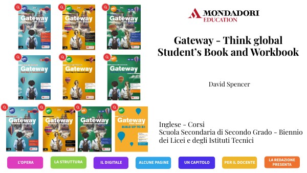 PER LO STUDENTEGateway – Think global A2 + Road Map to Communication, pp. 288 + 48 ISBN 9788836192489 Gateway – Think global B1 + Build up + Road Map to Communication, pp. 312 + 72 + 48 ISBN 9788836192526 Gateway – Think global Fast Track + Road Map to Communication, pp. 432 + 72 ISBN 9788836192588 Gateway – Essential Companion A2, pp. 120 ISBN 9788836192731 Gateway – Essential Companion B1, pp. 120 ISBN 9788836192779 Gateway – Essential Companion Fast Track, pp. 168 ISBN 9788836192816