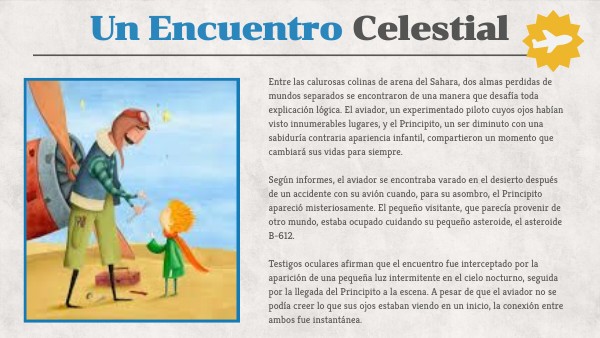 Entre las calurosas colinas de arena del Sahara, dos almas perdidas de mundos separados se encontraron de una manera que desafía toda explicación lógica. El aviador, un experimentado piloto cuyos ojos habían visto innumerables lugares, y el Principito, un ser diminuto con una sabiduría contraria apariencia infantil, compartieron un momento que cambiará sus vidas para siempre. Según informes, el aviador se encontraba varado en el desierto después de un accidente con su avión cuando, para su asombro, el Principito apareció misteriosamente. El pequeño visitante, que parecía provenir de otro mundo, estaba ocupado cuidando su pequeño asteroide, el asteroide B-612. Testigos oculares afirman que el encuentro fue interceptado por la aparición de una pequeña luz intermitente en el cielo nocturno, seguida por la llegada del Principito a la escena. A pesar de que el aviador no se podía creer lo que sus ojos estaban viendo en un inicio, la conexión entre ambos fue instantánea.