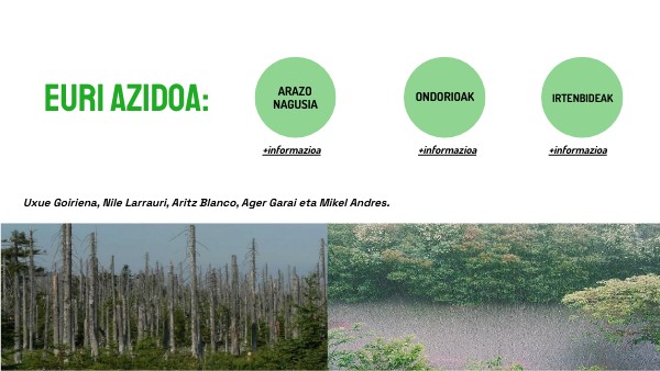 Euri azidoa prezipitatzen denean ingurumenari narridura eta korrosio handiak eragiten dizkio. Narridurari dagokionez, zuhaitzetako sustraiak kaltetzen dira, ondorioz, izurriteekiko erresistentzia txikiagoa dute eta gatz mineralak xurgatzerakoan zailtasunak eragiten dizkie. Gainera, korrosioak, hiri handietako azpiegituretako materialak jan egiten ditu, hori dela eta, eraikinak berriztu egin behar dira. Horrek material gehiago behar izatea eragiten du, hortaz, fabriketara berriro jo behar dugu eta sorgin-gurpil bat sortzen da.