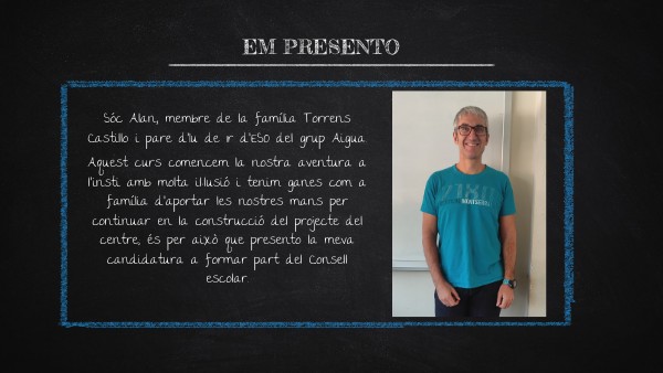 Sóc Alan, membre de la família Torrens Castillo i pare d'Iu de 1r d'ESO del grup Aigua. Aquest curs comencem la nostra aventura a l'insti amb molta il·lusió i tenim ganes com a família d'aportar les nostres mans per continuar en la construcció del projecte del centre; és per això que presento la meva candidatura a formar part del Consell escolar.