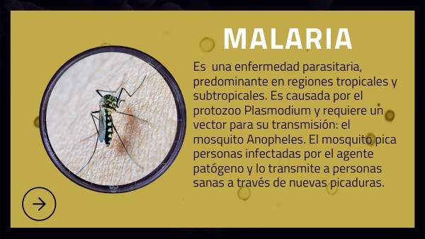 Es una enfermedad parasitaria, predominante en regiones tropicales y subtropicales. Es causada por el protozoo Plasmodium y requiere un vector para su transmisión: el mosquito Anopheles. El mosquito pica personas infectadas por el agente patógeno y lo transmite a personas sanas a través de nuevas picaduras.