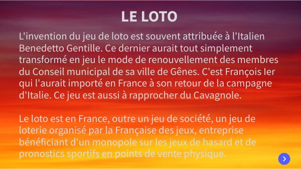 Le loto serait né au XVIe siècle en Italie, donc bien avant la date de sa création officielle, il y a 45 ans. Au départ, pas d’argent à la clé mais des places au Sénat pour 5 citoyens tirés au sort. Les Gueules Cassées, des vétérans de la Première Guerre Mondiale, portant des blessures au visage et à la tête, ont créé à des fins caritatives une sorte de tombola qu’on appelait « la dette » (dette de la France envers ses anciens combattants). Ils n’étaient pas considérés comme des blessés de guerre et de ce fait, ils ne bénéficiaient d’aucune aide de l’Etat, d’où l’idée de créer une loterie pour permettre de récolter des fonds pour leur venir en aide. À l’époque, les lots à gagner à cette tombola, étaient des bicyclettes et des avions de tourisme.