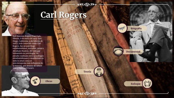Carl Rogers nació en 1902 en Illinois, Chicago. Se incorporó tarde a la escuela, pues sus padres lo educaron en casa, respetando su curiosidad y su temperamento independiente. Después de realizar estudios de agricultura y teología, que no completó, se licenció en psicología clínica por la Universidad de Columbia en 1931. Fascinado por el existencialismo y las teorías de Otto Rank, que describe la personalidad como un creativo proceso de individuación, empieza su carrera de profesor universitario, ejerciendo en Ohio, Chicago y Wisconsin. Desilusionado por la rigidez académica, finaliza sus días como investigador independiente, fundando un Centro para el Estudio de la Persona y un Instituto a favor de la Paz. Su obra más importante es Psicoterapia centrada en la persona, que aparece en 1951 y establece las bases de la Psicología Humanista.