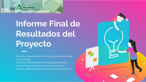 Proyecto: Implementación de un programa de reciclaje en la empresa.Acrónimo: PRS (Programa de Reciclaje Sostenible) Jefe de Proyecto: María Encarna Casquet Pérez Entidad: Centro Psicológico Educativo La Noria Blanca