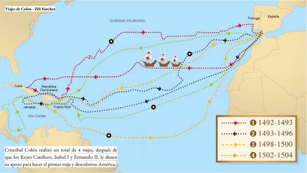 Cristóbal Colón realizó un total de 4 viajes, después de que los Reyes Católicos, Isabel I y Fernando II, le diesen su apoyo para hacer el primer viaje y descubriese América.